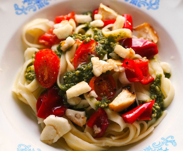 Sekoita halloumipalat ja uunissa paahtuneet kasvikset keskenään. Laita lautaselle nauhamakaronin päälle sekä pestoa että juustokasvisseosta haluamasi määrä kumpaakin.