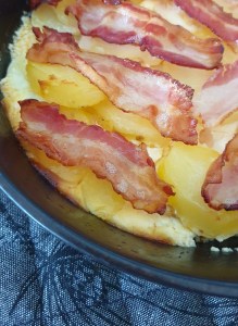 Paista uunissa n. 30 minuuttia jonka jälkeen lisää päälle pekonisiivuja. Laita takaisin uuniin vielä n. 20 minuutiksi tai kunnes pekoni on rapeaa.