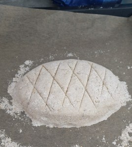 Laita pellille leivinpaperi ja ripottele sille runsaasti jauhoja. Kaada taikina pellille ja ripottele reippaasti jauhoja myös leivän päälle. Muotoile leipä haluamasi malliseksi – tämä onnistuu parhaiten, kun jauhotat kätesikin oikein kunnolla. Käytä jauhoja huoletta sopivan lopputuloksen saamiseksi. Kuvassa valmiiksi ”tapulteltu” leipä uuniin menossa.
