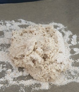 Lisää piimä vähitellen joukkoon samalla sekoittaen. Sekoittaminen onnistuu vaikkapa puulastalla tai lusikalla, mitään konetta ei tarvitse käyttää. Taikina jää melko löysäksi, mutta se kuuluu asiaan. Alla olevassa kuvassa koostumukseltaan sopiva taikina pellillä.
